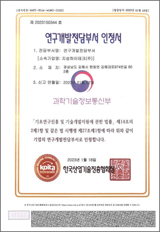 연구개발전담부서 인정서연구개발 전담부서 인증서는 기업이 연구개발 활동을 전문적으로 수행하는 부서를 보유하고 있음을 정부가 공식적으로 인정하는 서류입니다. |