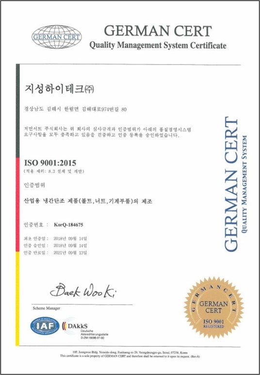 ISO 9001ISO 9001은 전 세계적으로 가장 널리 사용되는 품질경영시스템 표준으로, 이 인증을 취득한 기업은 글로벌 시장에서 신뢰도를 높일 수 있습니다. |